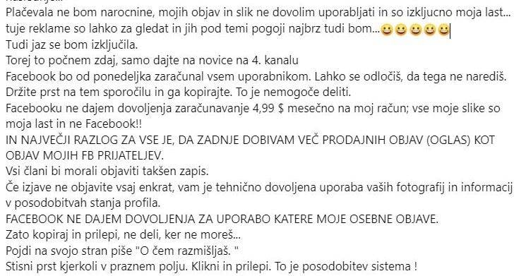 Besedilo objave navaja, da bo podjetje Meta (lastnik Facebooka) kmalu začelo zaračunavati okoli 4,4 evra na mesec vsem, ki objave ne bodo delili, hkrati pa si bo prisvojilo pravico do uporabe vseh njihovih osebnih podatkov. A kot poudarja uradno stališče podjetja Facebook, gre za popolnoma neresnične navedbe.