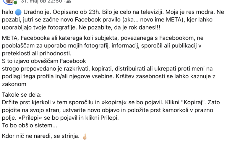 Zadnje dni je Facebook ponovno preplavila znana verižna objava, ki uporabnike straši, da bodo morali začeti plačevati za uporabo omrežja, če določenega zapisa ne bodo delili naprej.