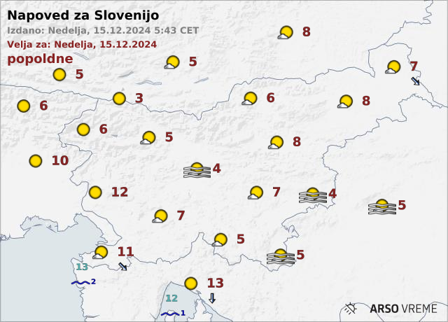 Najvišje dnevne temperature bodo od 3 do 8, na Primorskem do 12 stopinj Celzija, napoveduje Agencija Republike Slovenije za okolje.