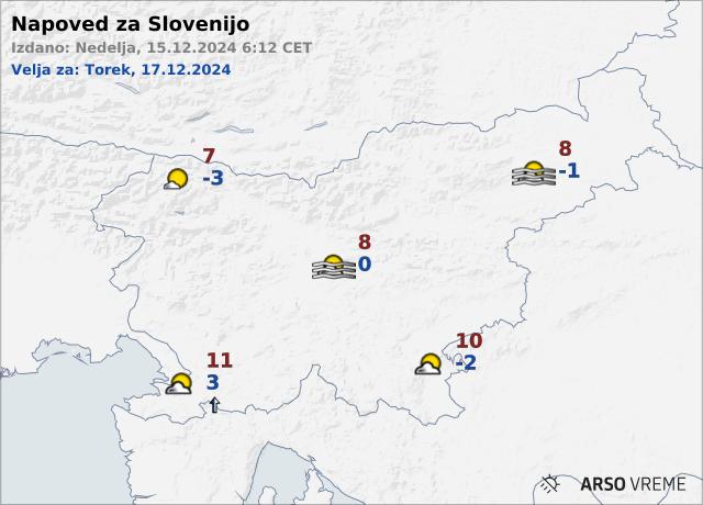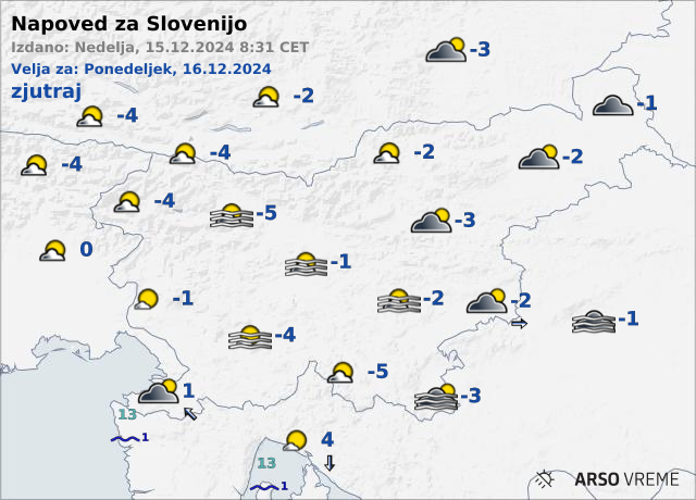 Po nižinah bo zjutraj in dopoldne vztrajala megla, nizka oblačnost se lahko pojavi tudi ob morju. Jutranje temperature bodo precej nizke, od -6 do -1 stopinje Celzija, ob morju bo nekoliko topleje, okoli 2 stopinji.
