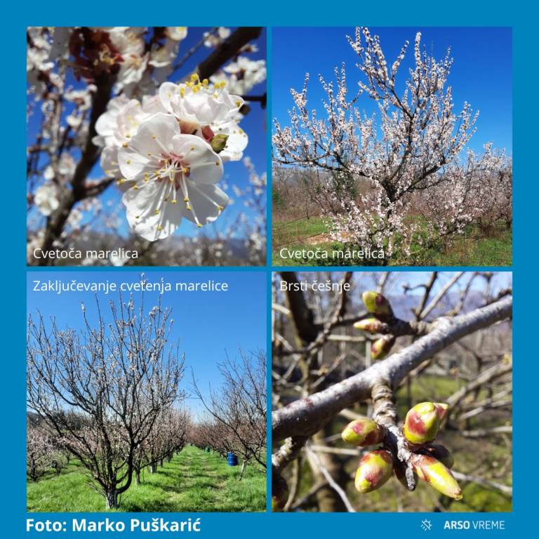 Po okvirnih podatkih s terena povsod bodisi cvetijo ali začenjajo cveteti marelice, ki pa v Slovenski Istri in na Vipavskem že zaključujejo s cvetenjem. Kritična temperatura za marelice je minus 2,9 stopinje Celzija v fazi odprtega cveta, so zapisali na Arsu.