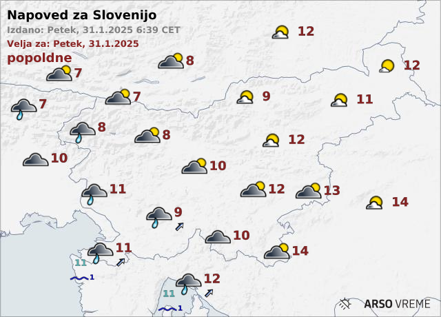 Popoldne bo na zahodu začelo rahlo deževati, zvečer pa se bo dež postopno razširil na večji del Slovenije, je zapisano na spletnih straneh Agencije Republike Slovenije za okolje. Najvišje dnevne temperature bodo od 7 do 12, na jugovzhodu do 14 stopinj Celzija.