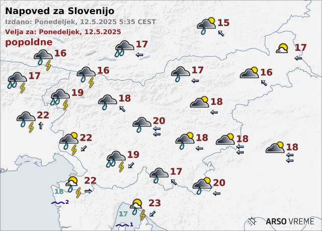 Sredi dneva se bodo pričele pojavljati krajevne padavine s posameznimi nevihtami. Na severovzhodu bo večinoma suho. Ponekod bo pihal veter vzhodnih smeri, zvečer na Primorskem šibka burja.
