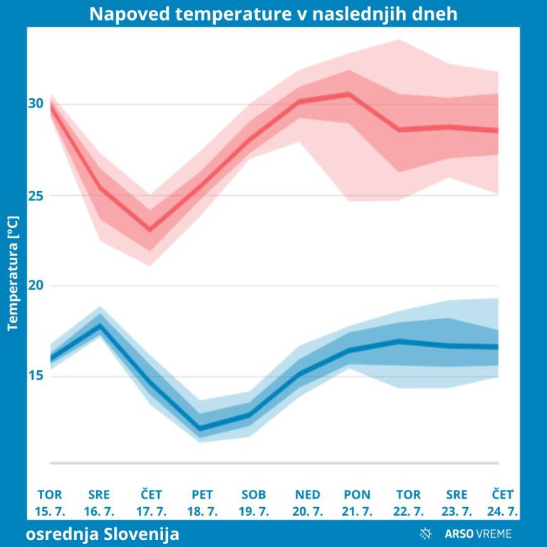 Osvežitev bo najbolj občutna v notranjosti Slovenije, kjer se ponekod temperatura ne bo povzpela nad 20 stopinj Celzija, medtem ko bo na Primorskem popoldne še od 25 do 30 stopinj Celzija.
