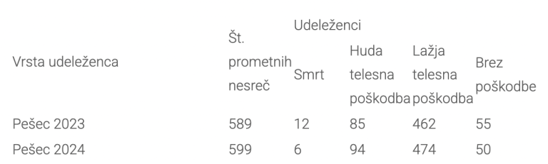 V letu 2024 pa so zabeležili še deset nesreč več, torej 599, s smrtnim izidom pa se je končala polovica manj nesreč, torej šest. Je pa bilo v lanskem letu v primerjavi s predlanskim devet pešcev več hudo poškodovanih in osem več z lažjimi telesnimi poškodbami. Brez poškodb jo je lani odneslo 50 pešcev.
