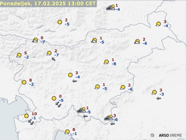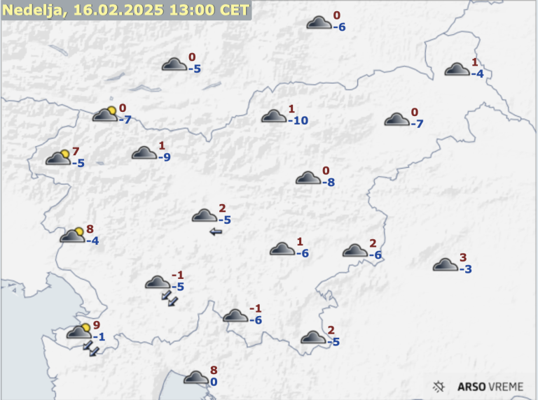 Ponoči se bo prehodno delno razjasnilo, vendar bo zjutraj Slovenijo znova zajela oblačnost. Temperature bodo padle med -8 in -4 stopinje, na Primorskem pa bodo ostale tik pod ničlo.