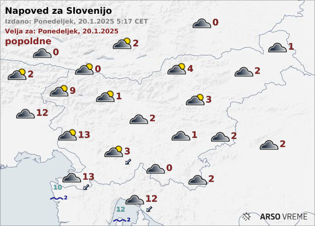 V torek čez dan bo večinoma oblačno. Predvsem na zahodu bo še občasno rosilo ali rahlo deževalo. Najvišje dnevne temperature bodo od -3 do 5, na Primorskem do 11 stopinj Celzija.