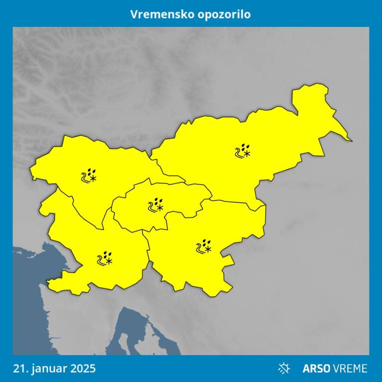 »V noči na torek in v torek zjutraj bo k nam iznad Sredozemlja zaneslo nekaj padavin,« navajajo vremenoslovci Agencije za okolje: »Količina padavin sicer ne bo velika (povečini le do nekaj milimetrov), a v krajih z negativnimi temperaturami v notranjosti Slovenije bo lahko nastala poledica, zato previdno na cestah in pločnikih.«