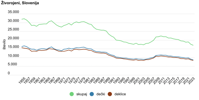 Še nikoli prej se namreč ni zgodilo, da bi Slovenke rodile manj kot 17.000 otrok v enem letu, leta 2023 pa se jih je rodilo 16.989, od tega 8.677 dečkov in 8.312 deklic. Ti podatki kažejo, da se je na tisoč prebivalcev rodilo osem otrok, kar je prav tako najmanj od leta 1922.