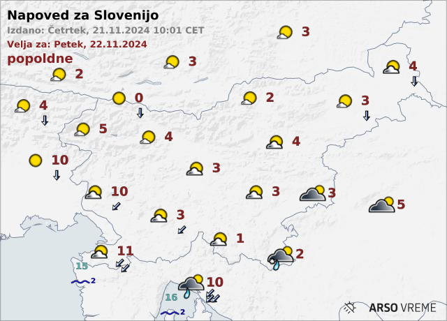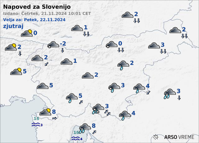 Popoldne se bo vreme poslabšalo, pri čemer bo ponekod zapihal jugozahodni veter. Najvišje dnevne temperature pa bodo med eno in devetimi stopinjami Celzija, na Primorskem pa bo temperatura dosegla okoli 11 stopinj.