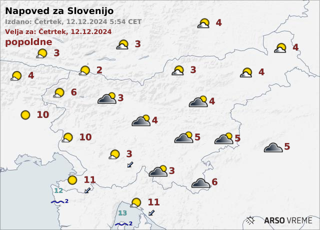 Najvišje dnevne temperature bodo od 2 do 6, na Goriškem in ob morju okoli 10 stopinj Celzija.