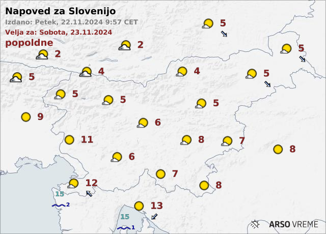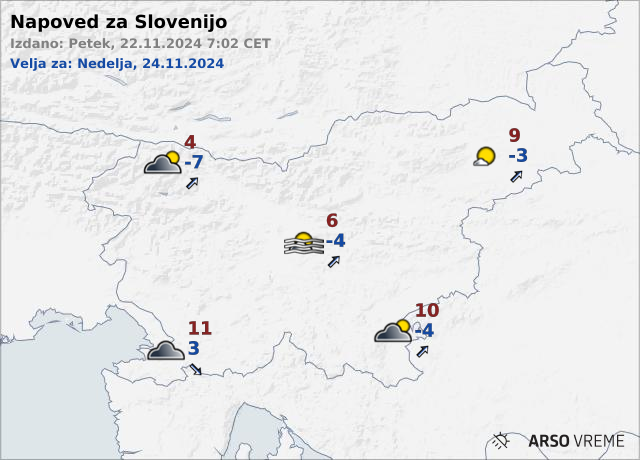V soboto nato na agenciji za okolje napovedujejo pretežno jasno vreme. Najnižje jutranje temperature bodo od -9 do -3, ob morju malo nad 0, najvišje dnevne pa od 3 do 8, na Primorskem do 11 stopinj Celzija.