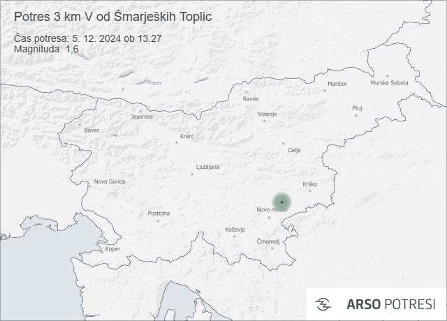 Seizmografi državne mreže potresnih opazovalnic so danes ob 13.27 zabeležili zmeren potresni sunek, magnitude 1,6. Po prvih podatkih je bilo žarišče potresa 60 kilometrov vzhodno od Ljubljane, v bližini Šmarjeških Toplic.