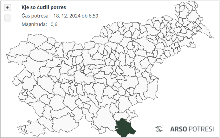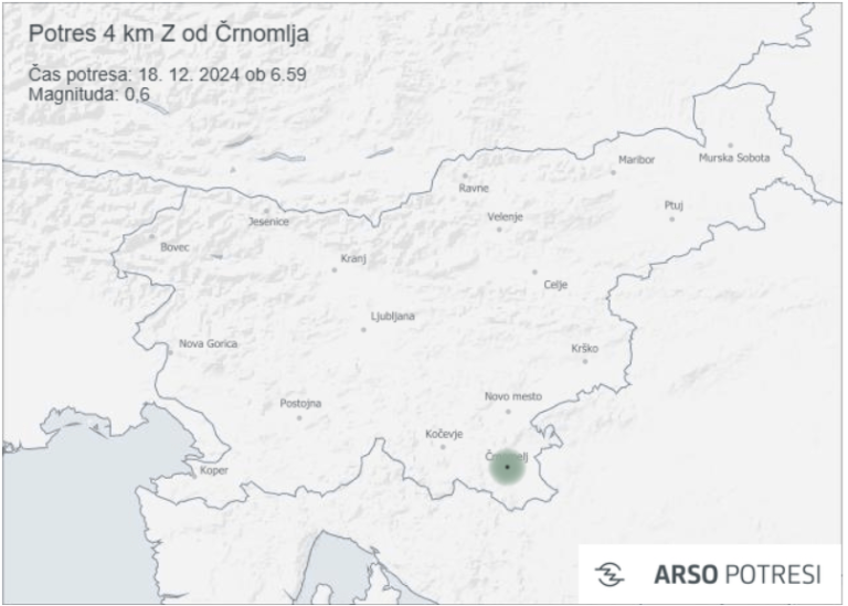 Seizmografi državne mreže potresnih opazovalnic so danes, 18. decembra 2024, ob 6.59, zabeležili šibak potres z magnitudo 0,6.