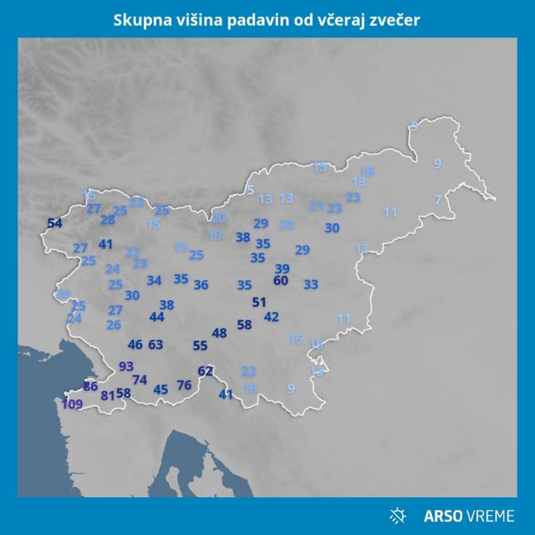 Skupno je največ padavin padlo na jugozahodu države, ob morju tudi več kot 100 milimetrov. Drugod večinoma od 20 do 60 milimetrov.