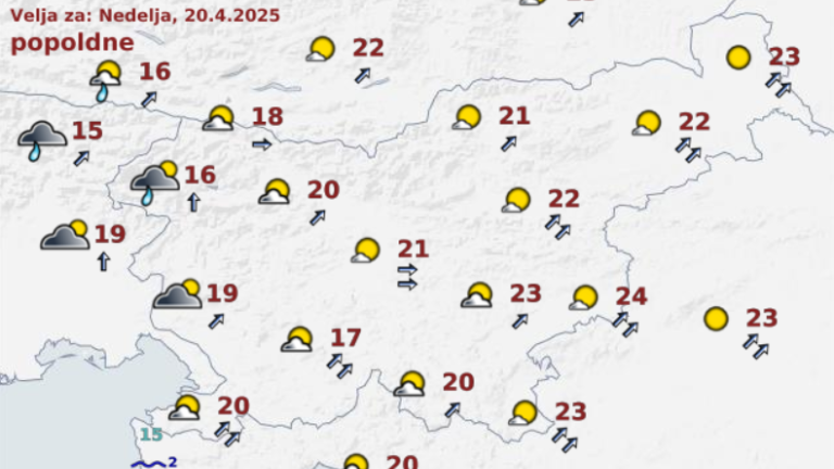 Najvišje dnevne temperature bodo od 16 do 21, v vzhodnih krajih do 24 stopinj Celzija.