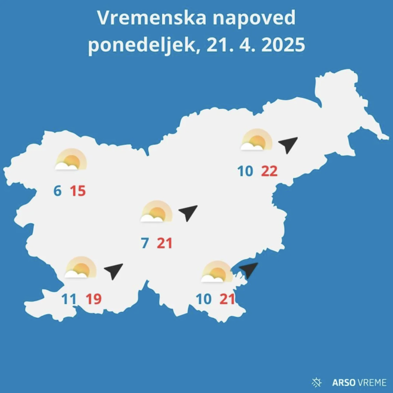 Danes nas čaka večinoma sončno vreme, le na zahodu bo pretežno oblačno z možnimi občasnimi plohami, ki bodo pogostejše v hribovitem svetu. Pihal bo jugozahodni veter, najvišje dnevne temperature pa se bodo gibale med 14 in 19 stopinj, na vzhodu pa bodo termometri lahko pokazali do 21 stopinj Celzija.