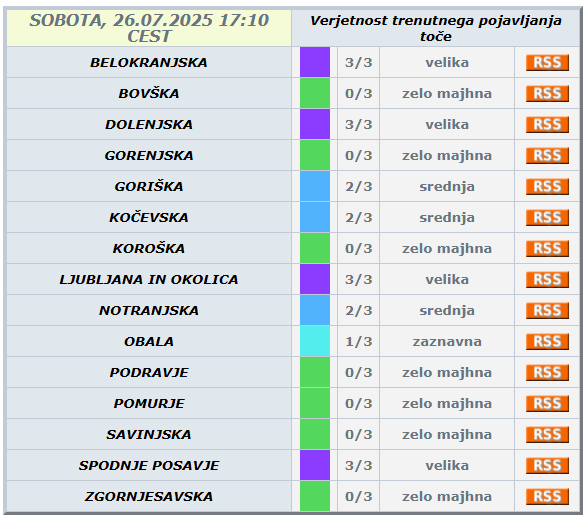 Lokalno so možni močnejši nalivi, agencija za okolje je zaradi visoke verjetnosti toče prižgala tudi vijolični alarm.
