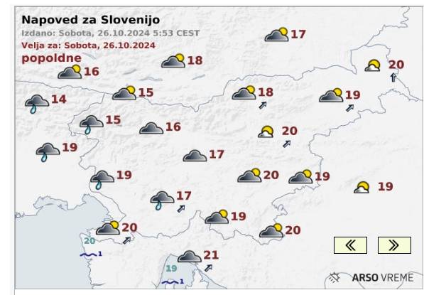 Jutri bo v vzhodni in osrednji Sloveniji povečini sončno in po nižinah sprva megleno. Na zahodu bo zmerno do pretežno oblačno. Ponekod bo pihal jugozahodni veter. Najnižje jutranje temperature bodo od 9 do 14, najvišje dnevne od 17 do 22 stopinj Celzija.