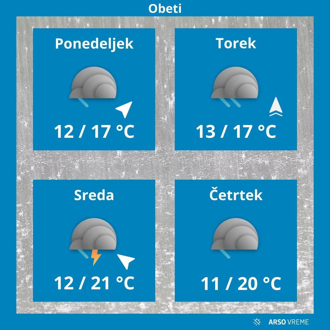 Dopoldne bo občasno rahlo deževalo predvsem v južnih in zahodnih krajih, popoldne postopno tudi v osrednji Sloveniji. V severnih in vzhodnih krajih bo večinoma suho. Predvsem na Štajerskem, Koroškem in v Prekmurju bo pihal jugozahodnik.