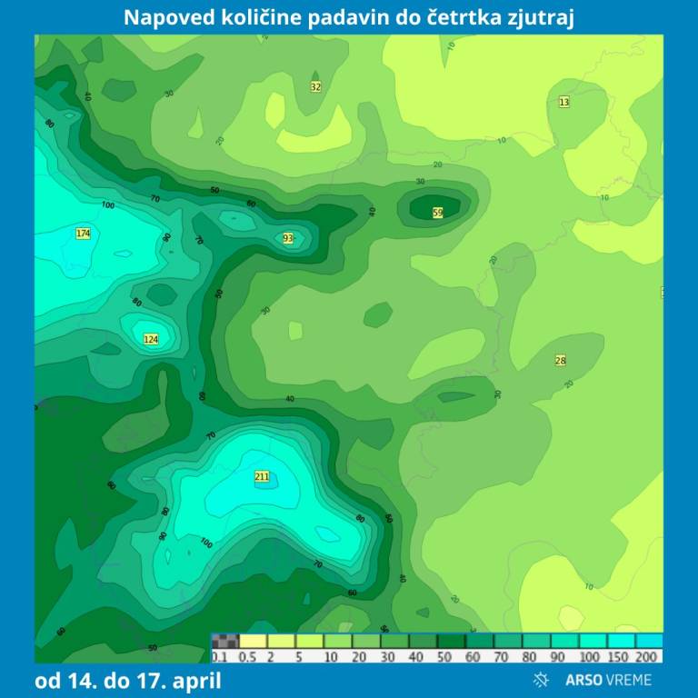 Do četrtka največ dežja pričakujejo v Zgornjem Posočju in na območju Snežnika, kjer lahko pade okoli 150 milimetrov dežja. Nekoliko manj padavin, od 60 do 120 milimetrov, bo padlo na Trnovskem gozdu in drugod v Alpah. Precej dežja, od 50 do 80 milimetrov, bo padlo tudi na Primorskem in v delu Notranjske.