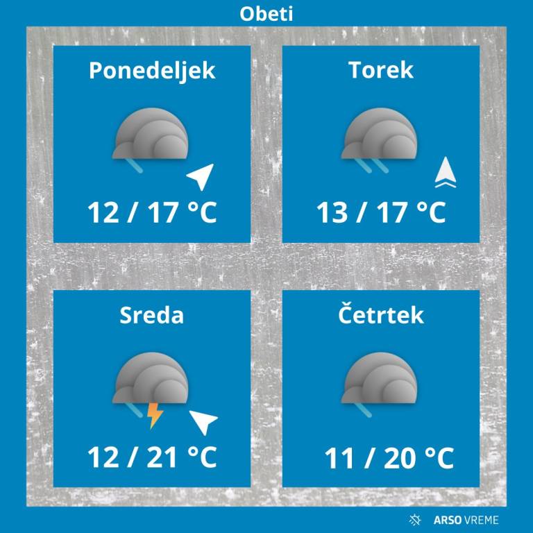 Popoldne bo dež v večjem delu države postopno ponehal, le ponekod na zahodu in severu bo občasno še deževalo. Zvečer se bo oblačnost začela trgati. Pihal bo okrepljen južni veter, ob morju zmeren jugo. Najvišje dnevne temperature bodo od 13 do 19 stopinj Celzija.