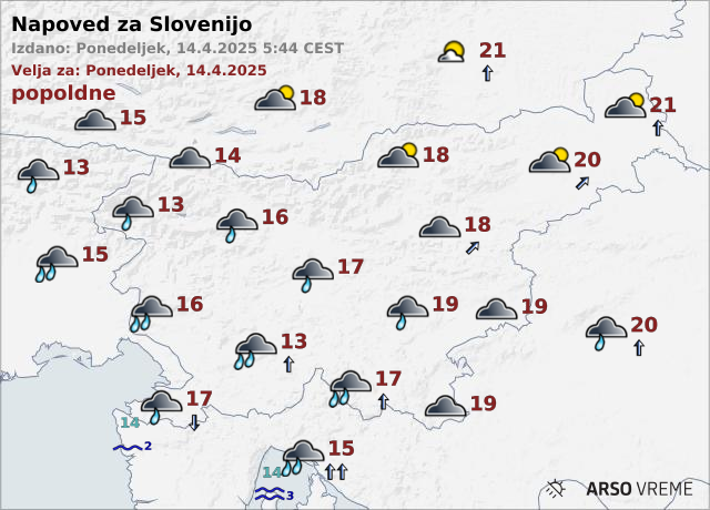 Najvišje dnevne temperature bodo od 13 do 18, na vzhodu do 21 stopinj Celzija.