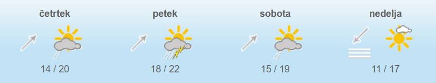 Jutri bo v hribovitih predelih sicer občasno deževalo, drugod bo zmerno do pretežno oblačno, a večinoma suho. Jutranje temperature bodo od 11 do 17, najvišje dnevne od 17 do 23 stopinj Celzija.