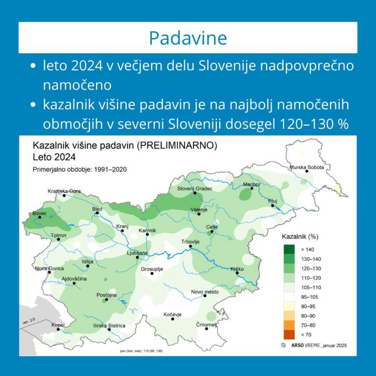 Tudi višina padavin je bila leta 2024 nad dolgoletnim povprečjem. Kazalnik višine padavin je znašal 110 odstotkov, kar leto 2024 uvršča na približno 11. mesto najbolj namočenih let v obdobju 1950–2024.