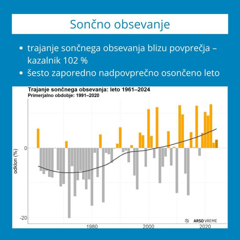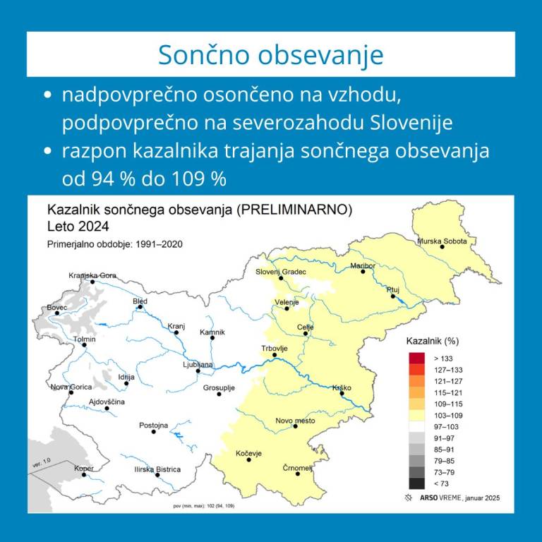 Leto 2024 je bilo na ravni Slovenije normalno osončeno, s kazalnikom trajanja sončnega obsevanja na državni ravni 102 odstotkov, kar leto uvršča na približno 18. mesto najbolj osončenih let v obdobju 1961–2024.