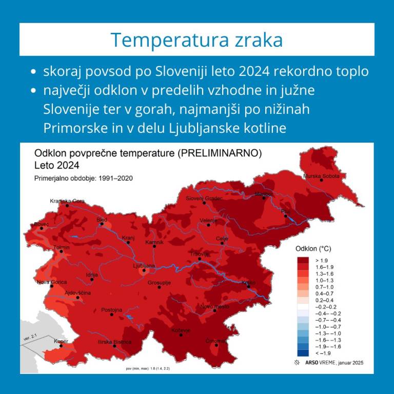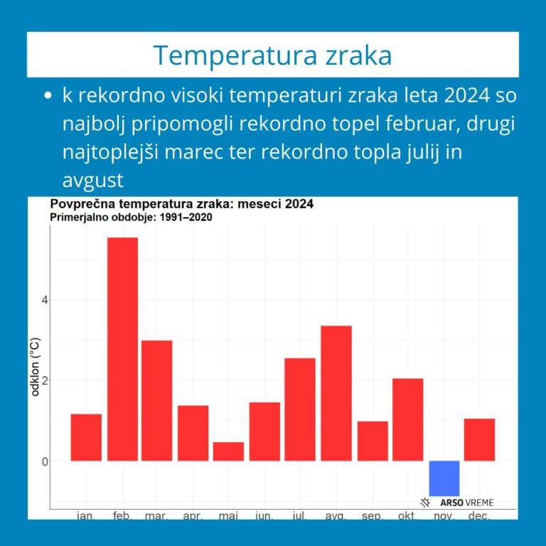 Vremenoslovci pojasnjujejo, da je odklon temperature zraka od povprečja primerjalnega obdobja 1991–2020 na državni ravni znašal 1,8 stopinjo Celzija, zaradi česar je leto 2024 najtoplejše od začetka primerljivih podatkov, to je od leta 1950.
