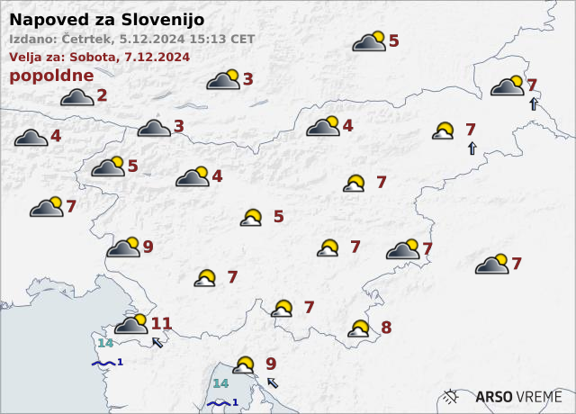 Predvsem v notranjosti Slovenije bodo možne kratkotrajne plohe, ponekod pa bo zapihal jugozahodni veter. Najvišje dnevne temperature bodo med dve in sedem, ob morju pa okoli deset stopinj Celzija
