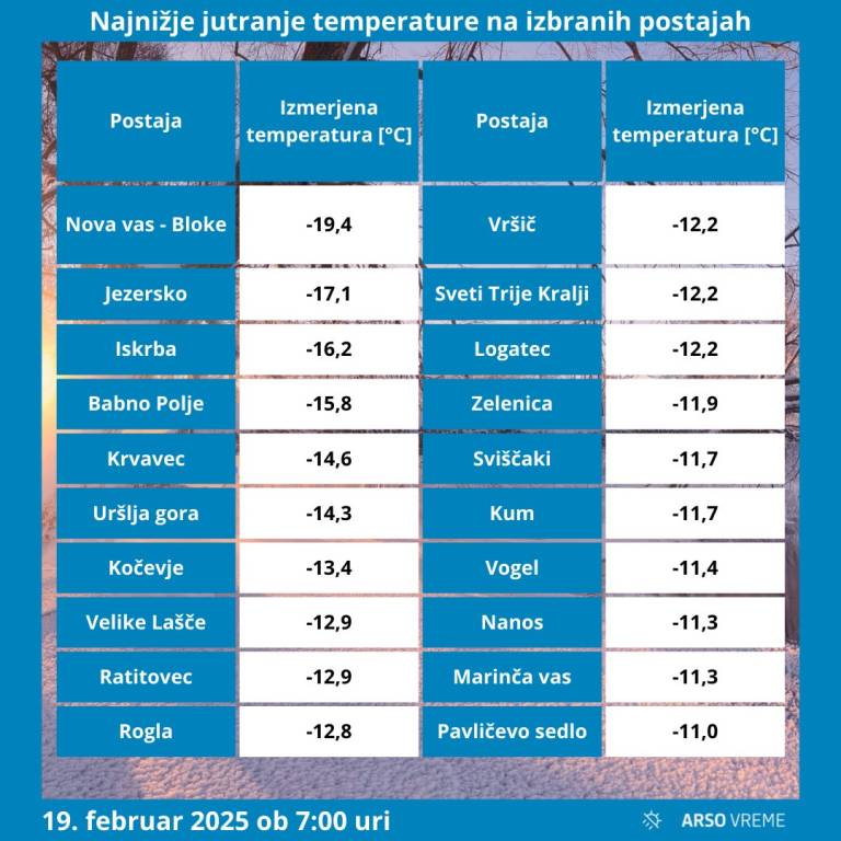 Zaradi polarne zračne mase, ki v teh dneh vztraja nad našimi kraji, so se jutranje temperature ob jasnem in mirnem vremenu marsikje spustile pod -10 stopinj Celzija, z izjemo Gorenjske, kjer je ponoči še vztrajala oblačnost. Najbolj mrzlo je bilo v krajih s snežno odejo, ponekod se je temperatura spustila do skoraj -20 stopinj Celzija.