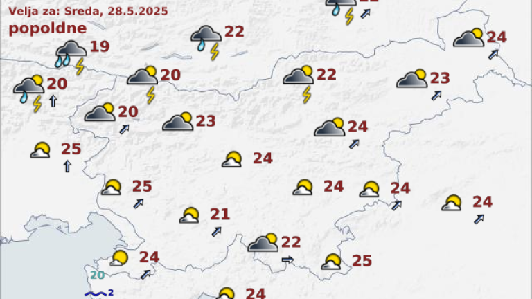 Proti večeru se bo od severa začelo oblačiti, nastajati bodo začele plohe in nevihte. Najvišje dnevne temperature bodo od 20 do 25 stopinj Celzija.