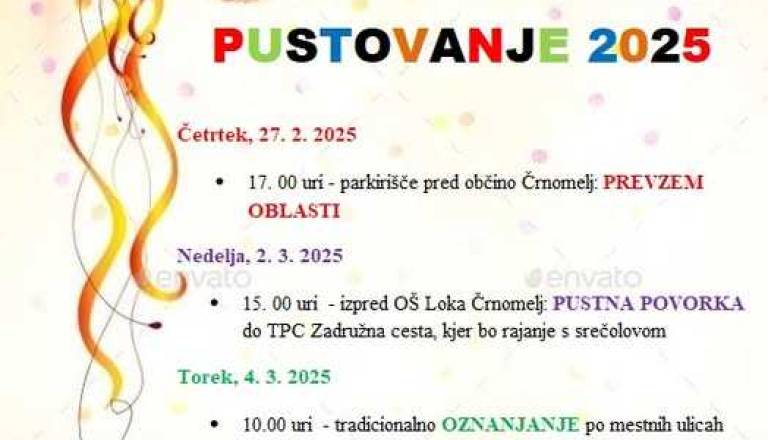 10.00: Oznanjanje po mestnih ulicah 20.00: Varovanje pusta (Klas bar) s Črnomaljsko godbo