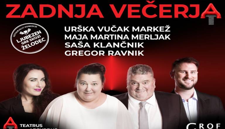 ZADNJA VEČERJA Nova komedija ustvarjalcev uspešnice Ljubezen gre skozi želodec. IGRAJO: URŠKA VUČAK MARKEŽ, MAJA MARTINA MERLJAK, SAŠA KLANČNIK in GREGOR RAVNIK ...